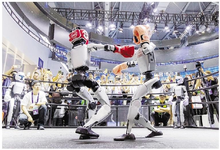 宇树机器东谈主在第四届巨匠数字生意展览会上。记者 步恩撒/摄